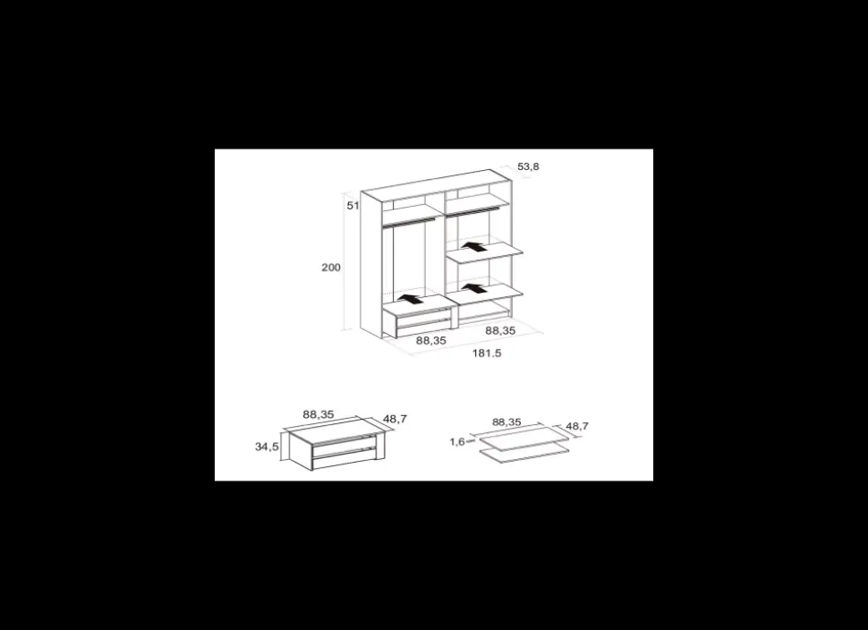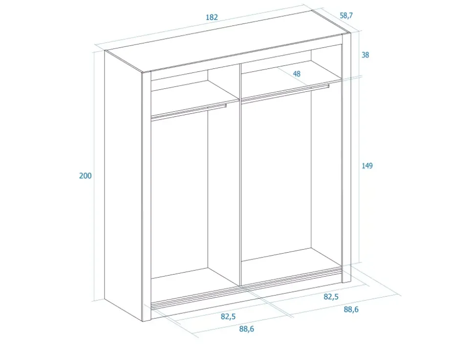 – Distribución interior dos cuerpos, con estante a modo de altillo, barra para colgar.