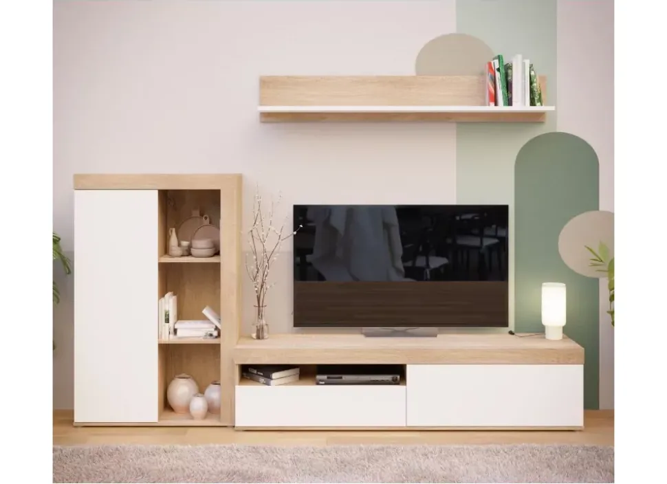 La composición KALM es un apilable de salón con diversos módulos que ofrecen gran capacidad de almacenaje. Esta formada por: aparador alto, mueble tv y estante de pared.