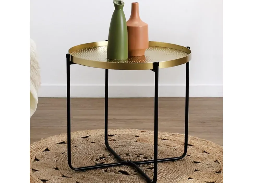 Transforma tu espacio con esta mesa auxiliar QAMAN de hierro, bandeja dorada y patas negras. Súper práctica, ¡es plegable! Ideal para lugares pequeños, combina diseño moderno con funcionalidad. Su bandeja tiene un toque martillado que le da un aire único y desenfadado.