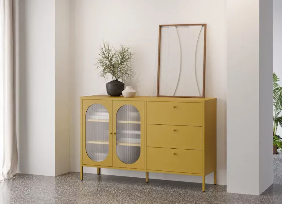 ¿Buscas ese mueble que lo cambie todo? Este aparador COLORS es el fichaje perfecto para romper con lo aburrido. Su estructura metálica, con dos puertas de cristal y tres cajones espaciosos, lo convierte en el equilibrio ideal entre funcionalidad y estilo.