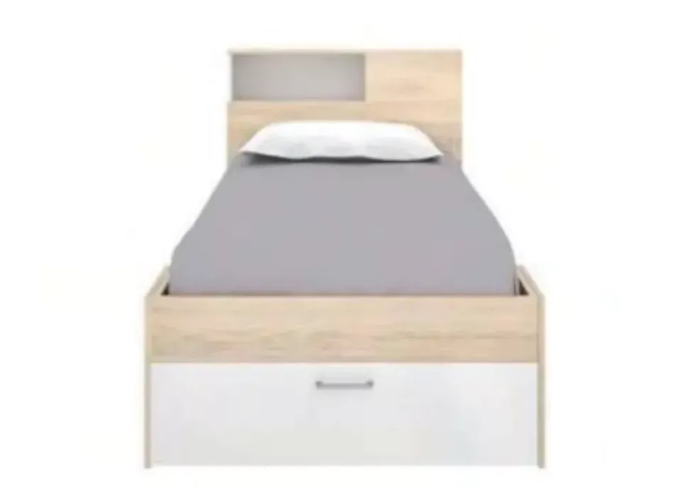 La cama NALA es una cama individual compacta juvenil con espacios extra de almacenaje para tus cosas, gracias a su cabezal a forma de estantería y los dos compartimentos situados debajo de la cama, en frente y a un lateral, perfecta para espacios pequeños y distribuir de mejor manera el espacio en tu dormitorio.