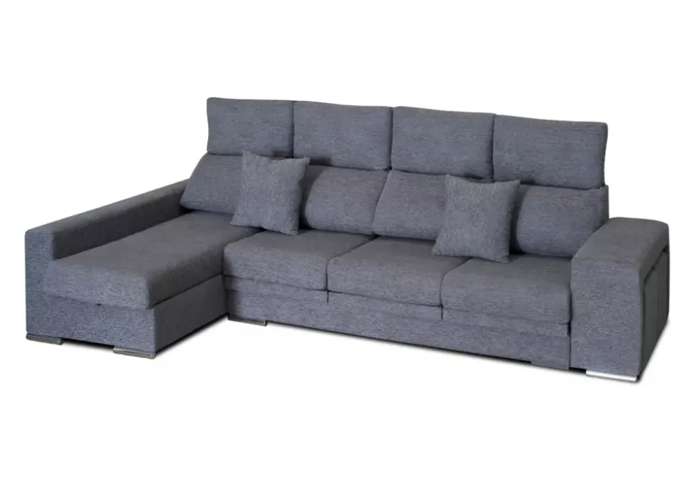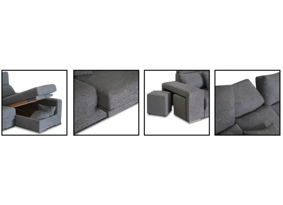 El sofá chaise longue LIRIO ofrece la máxima adaptación, con cabezales reclinables y asientos deslizantes. Además, incluye un amplio arcón elevable, dos pufs ocultos en brazo y dos cojines