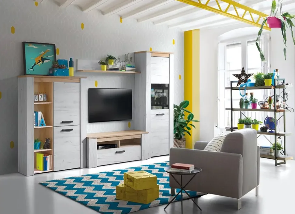 La librería KENT es una composición exclusiva con un diseño actual, líneas rectas y gran capacidad. Combina dos colores muy suaves para que armonicen sin conflictos con el resto de piezas de tu salón. Compuesta por mueble para TV, vitrina alta, vitrina baja y estantería.