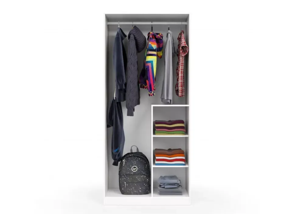 – El armario incluye barra para colgar y divisor con tres estantes en su parte derecha.