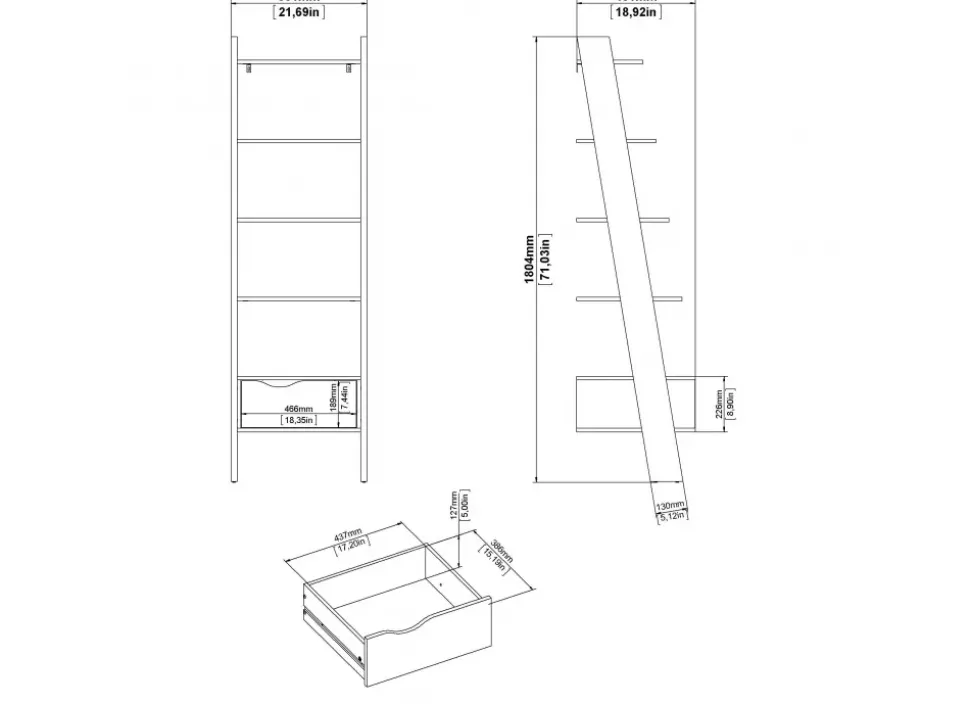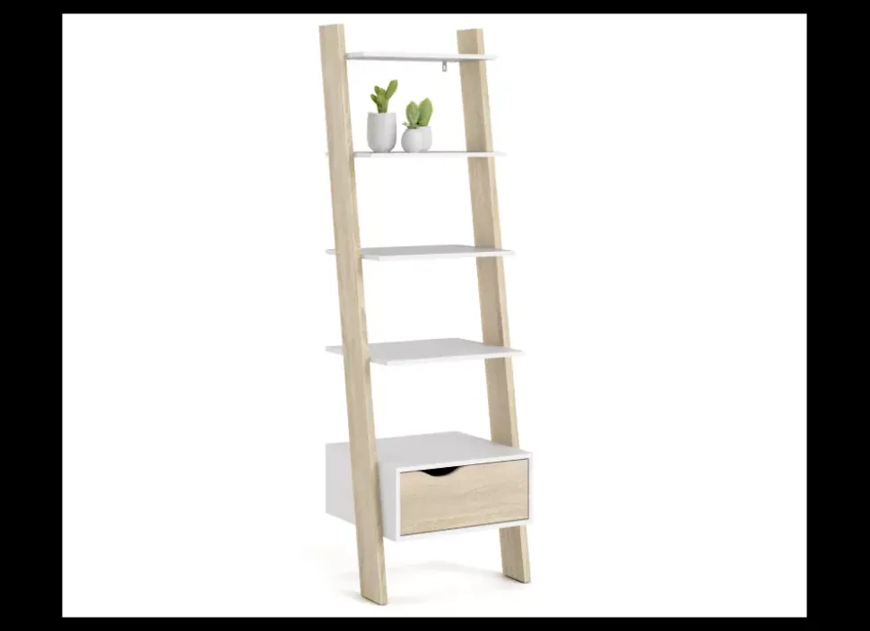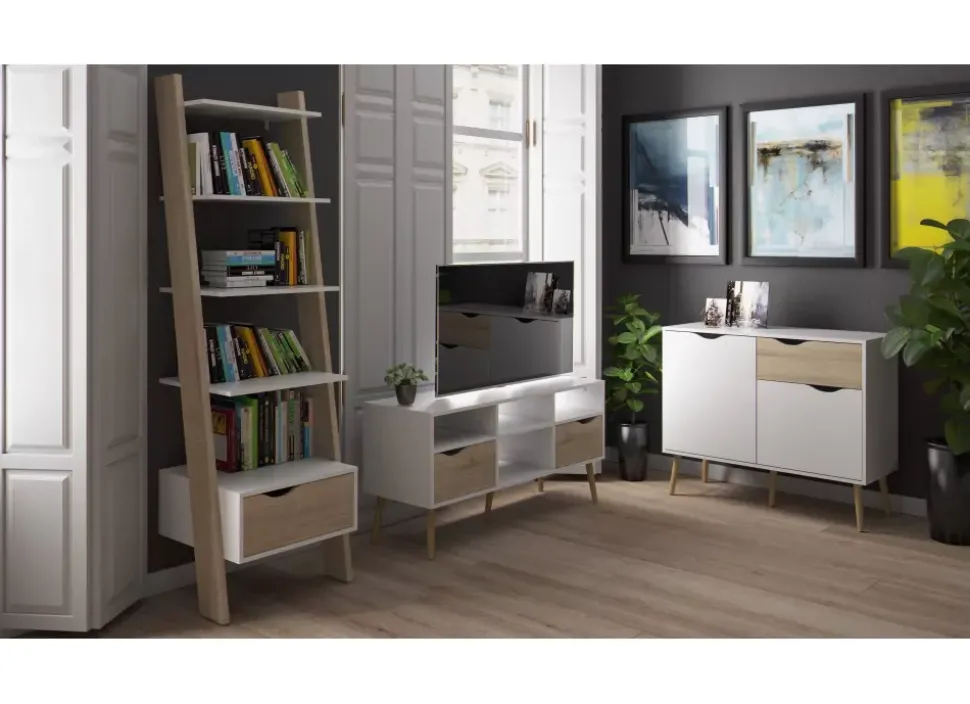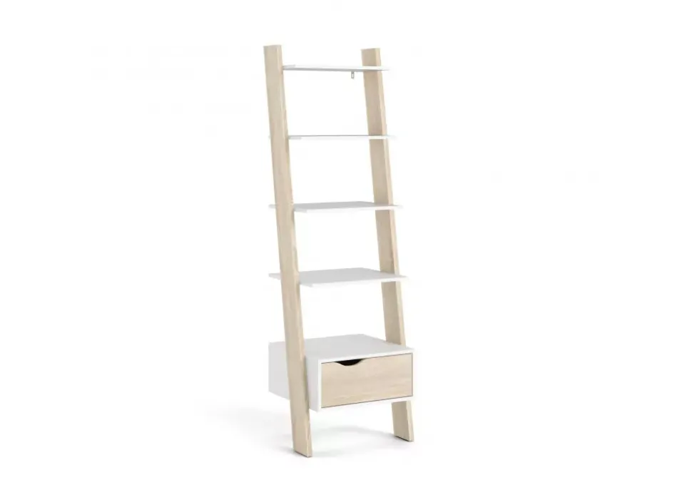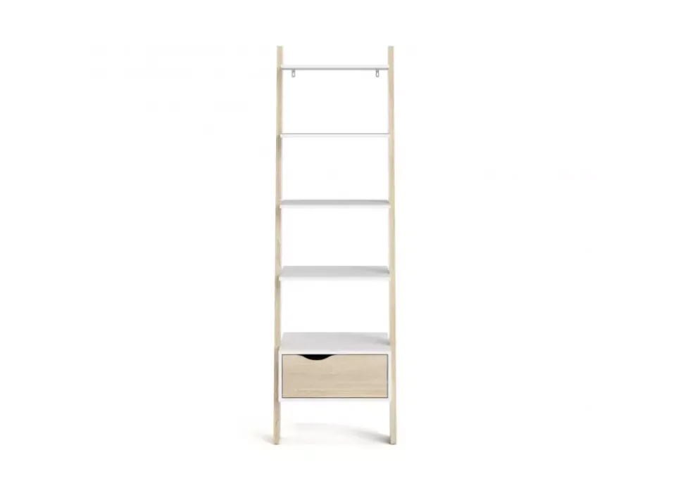 La estantería de pie en escalera TAK forma parte de una colección de piezas auxiliares que dará a tu salón una personalidad propia y diferente. La estantería tiene un cajón inferior para almacenamiento y cuatro estantes (5 huecos) para colocar todos tus libros o tu decoración. La colección TAK formará parte de tu salón o estancia para darle un aire nórdico. Disponible también la mesa de TV. y la mesa de centro a juego.