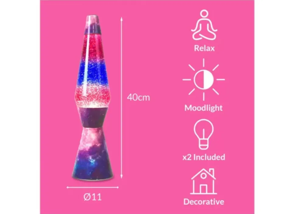 La lámpara de lava GALAXY te relajará a la vez que sirve como lámpara decorativa. Su efecto relajante deriva en el efecto hipnótico de la cera al subir y bajar por el líquido de la lámpara. Además la cera de colores y los efectos de la purpurina, son un adorno fundamental para todo dormitorio o habitación.