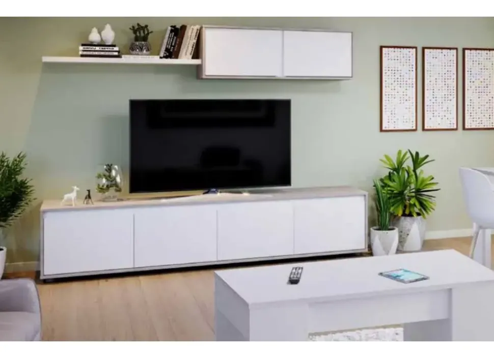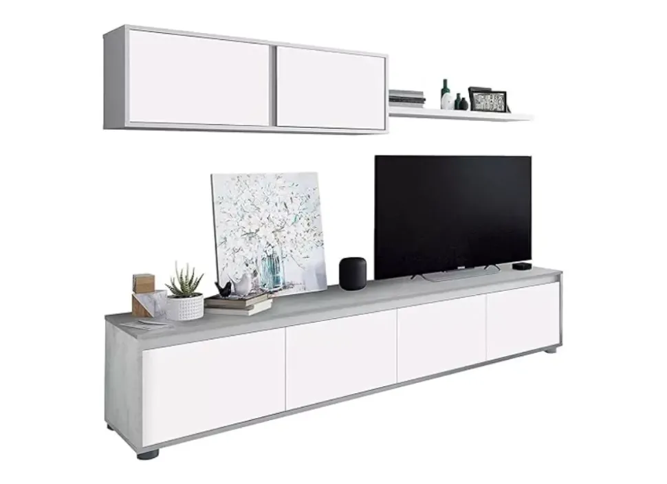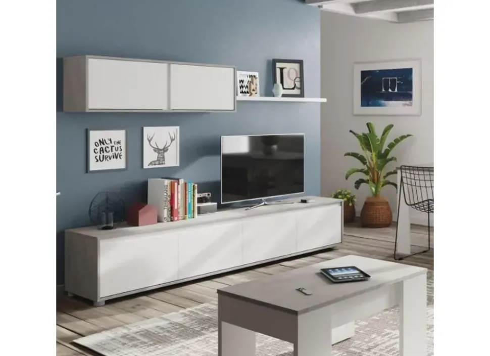 La librería completa modelo CENTURY es una composición con la que puedes amueblar un salón moderno y a la última al mejor precio. Incluye mueble bajo para la televisión con puerta apertura abatible, módulo de dos puertas y estantes y estante, todo incluido en el precio.