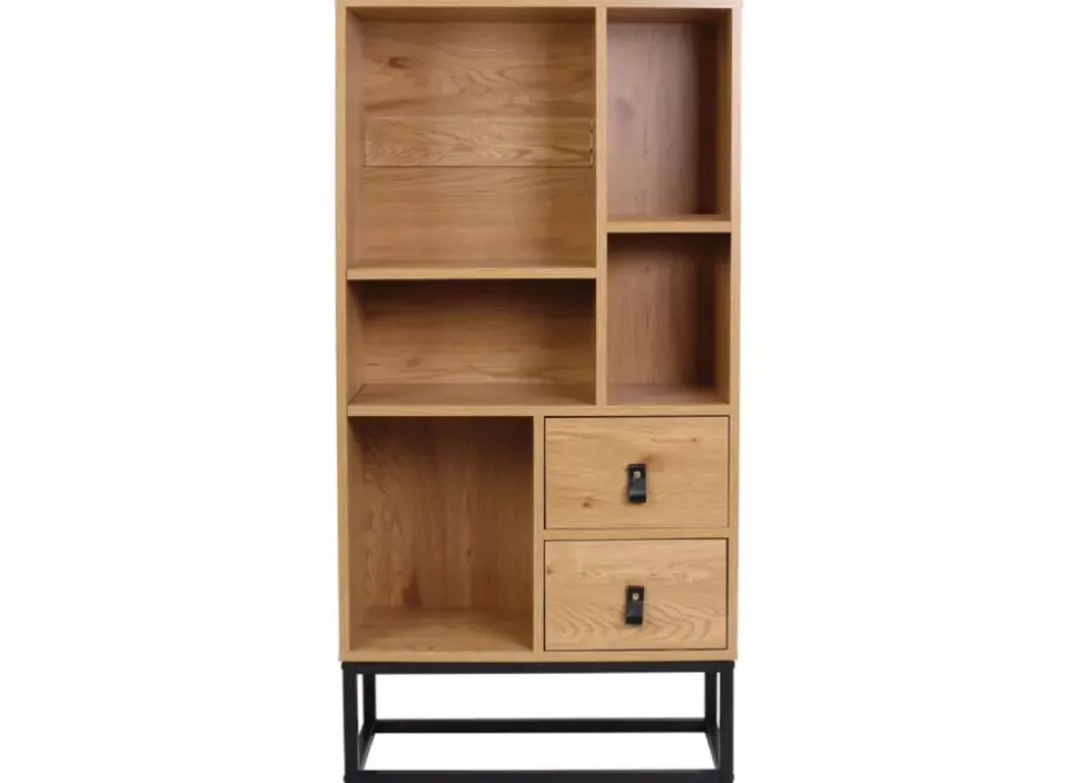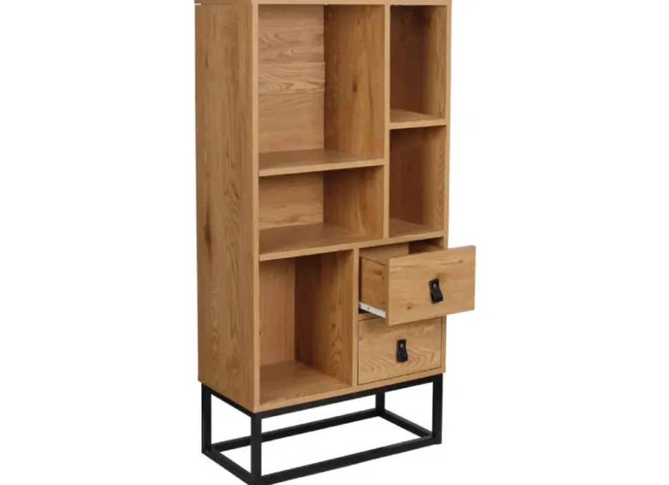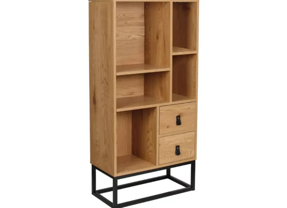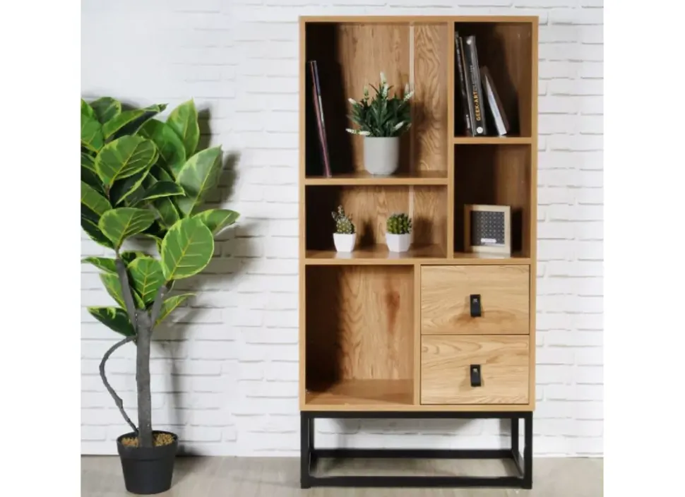 La librería HELSINKI, con dos cajones y cinco estantes tiene un diseño rústico y moderno que creará en tu hogar un espacio de confort con elegancia. Además de permitirte almacenar objetos en sus cajones inferiores y en sus estantes superiores.