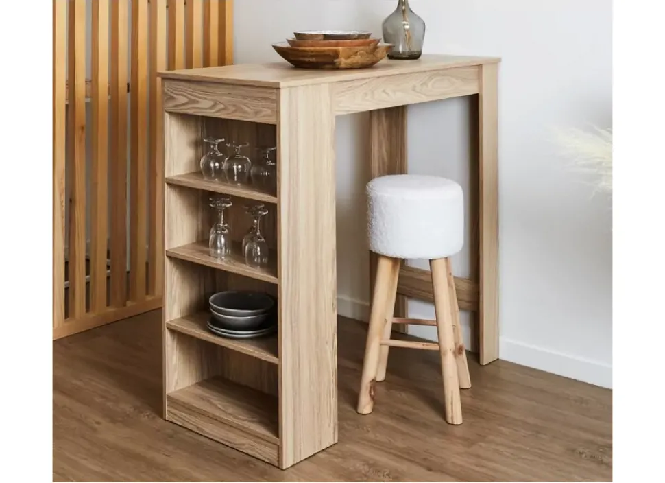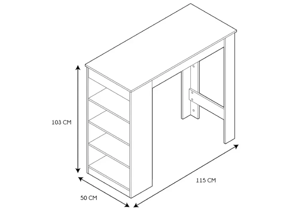La mesa bar AXEL cuenta con una amplia encimera y con 4 estantes en un lateral, que proporcionan espacio para almacenar tu cristalería, vasos, botellas, frascos de comida.