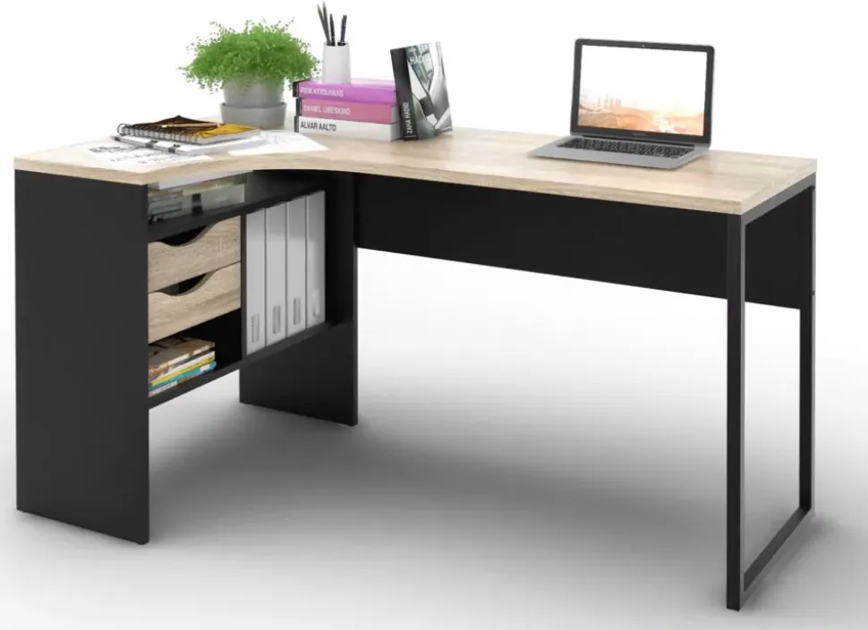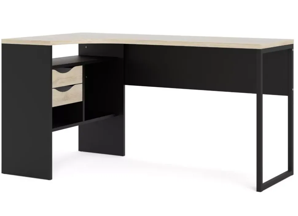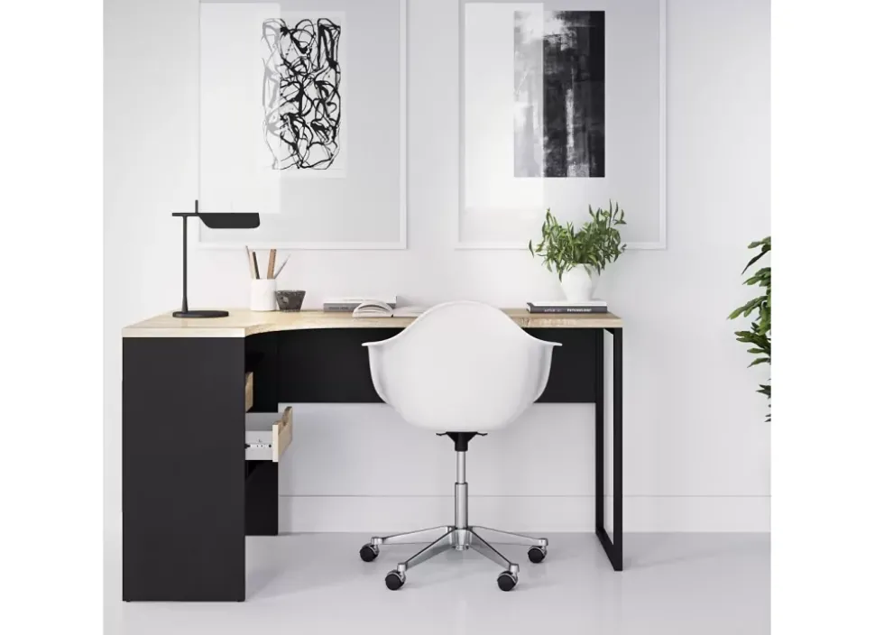 La mesa de rincón FIRE tiene un diseño especial en absoluta tendencia, una gran superficie de trabajo y cajones para almacenaje.