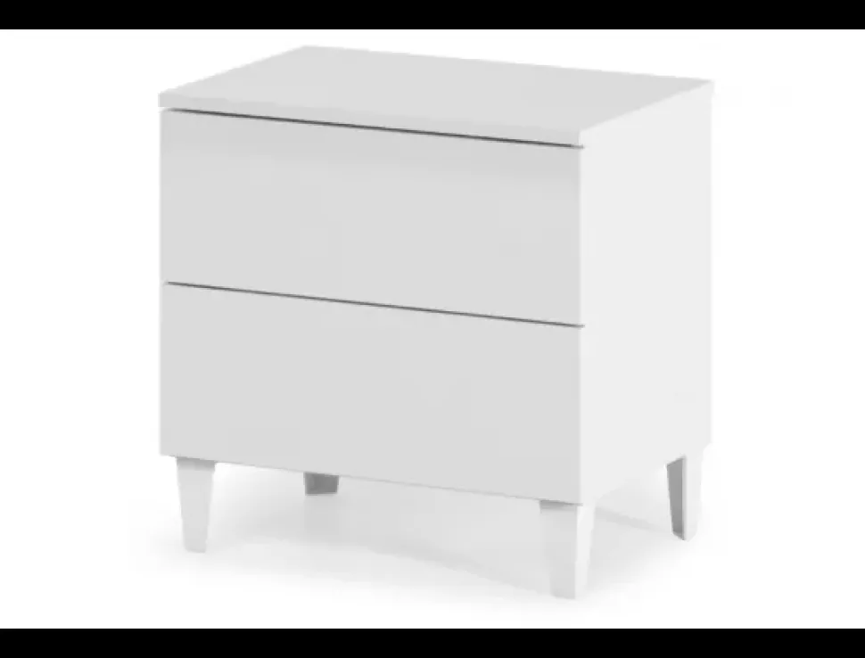 La mesilla de dos cajones modelo MILANO es una moderna y práctica pieza auxiliar, fabricada en laminado natural y acabada en color blanco brillo. Aporta al hogar un elegante toque decorativo y una solución de almacenamiento gracias a sus cajones. Se trata de un mueble fácil de combinar y encajar en cualquier espacio, gracias a su aspecto sobrio y moderno, con patas abiertas estilo nórdico.