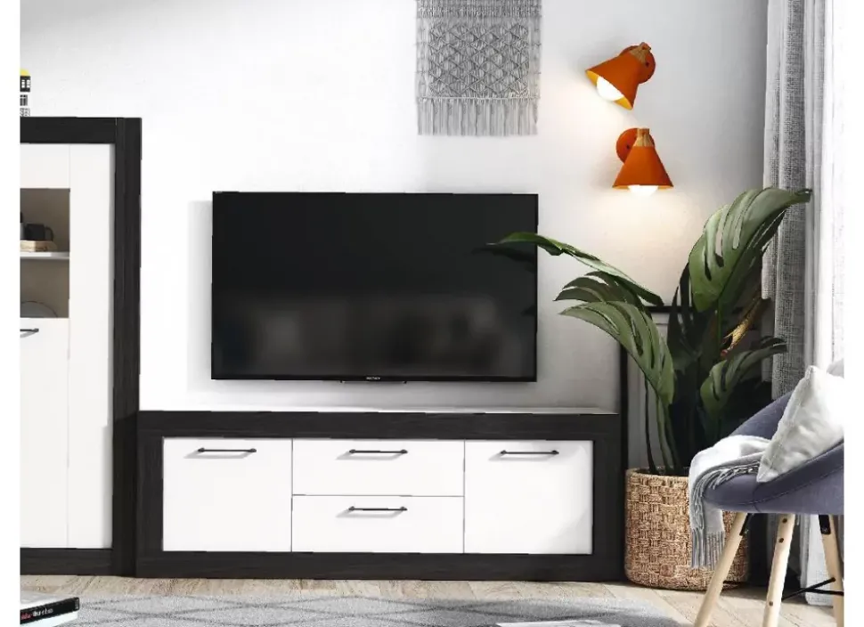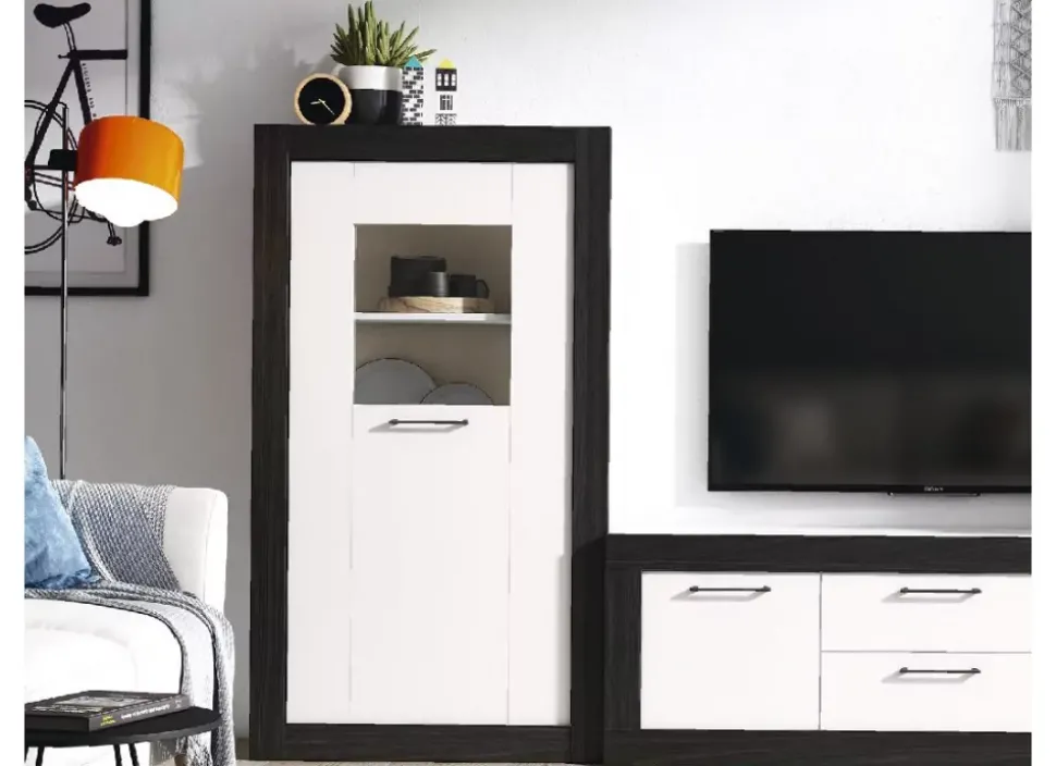La composición AVEBURY, de diseño contemporáneo, está formada por mueble tv sin patas y vitrina baja. Sus colores, blanco mate y bocamina, combinan con cualquier estilo decorativo.