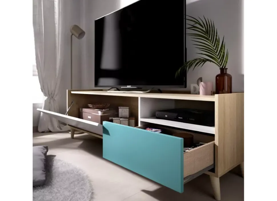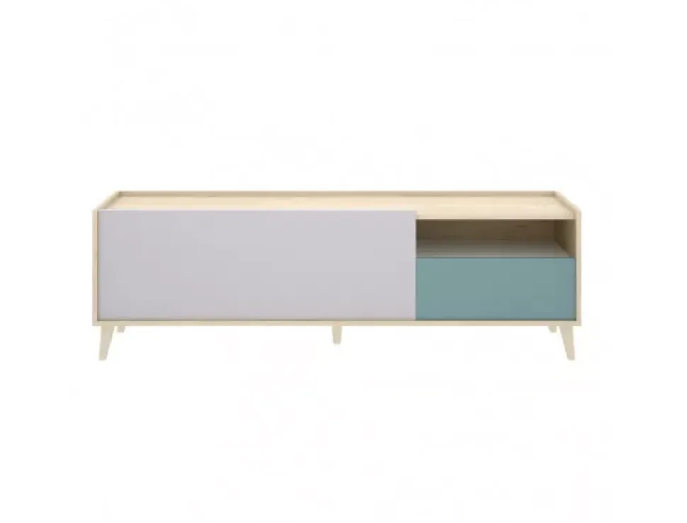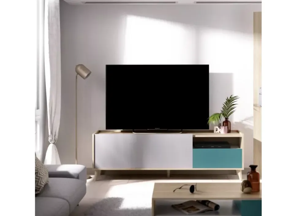 El mueble para TV OVAN de una puertas y un cajón tiene un diseño moderno con una original combinación de colores que lo hace muy atractivo, con una puerta en color gris y cajón en color esmeralda, muy práctico en espacios pequeños para almacenar tus cosas.
