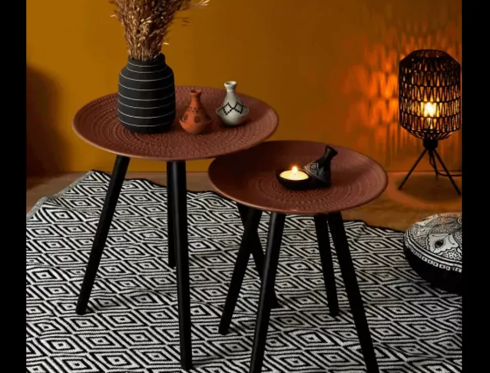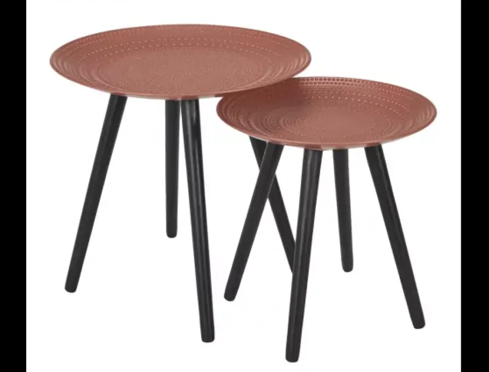 Set de mesas nido TANGER, La forma de «plato» de la bandeja combina originalidad y funcionalidad, para que tus pequeños objetos ya no se caigan. Su estampado de «lunares» en relieve aporta encanto y un toque de autenticidad a este modelo.