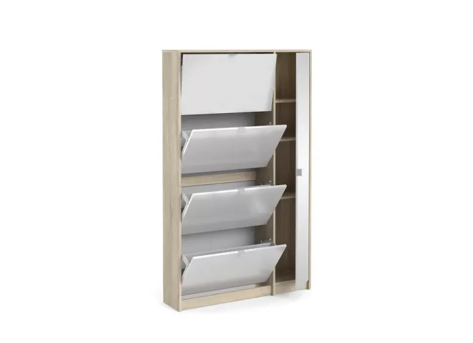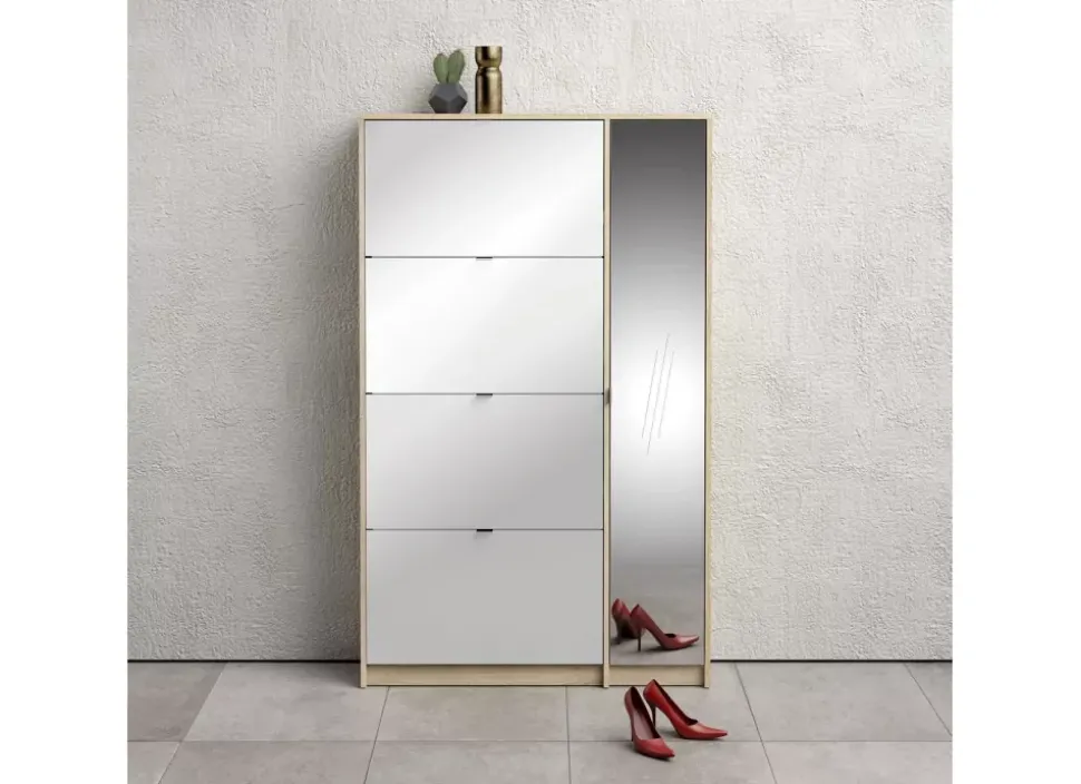 El zapatero MACK con 4 puertas abatibles y 1 puerta larga espejo en color roble patinado y blanco alto brillo, se adapta a cualquier ambiente por su diseño y además podrás tener todo en orden y organizado.